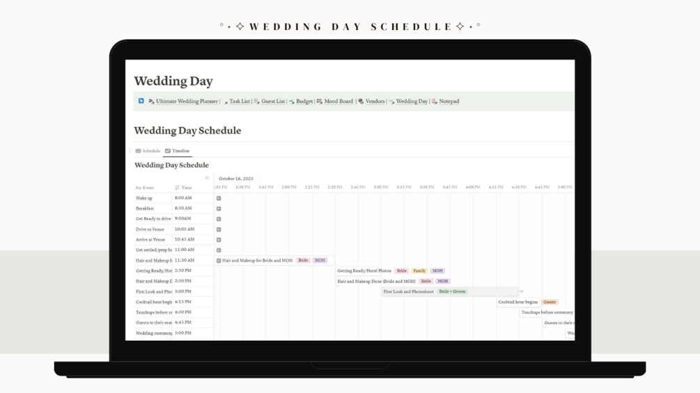 Plan out your big day from start to finish, with a detailed schedule of events, including ceremony, reception, and everything in between.