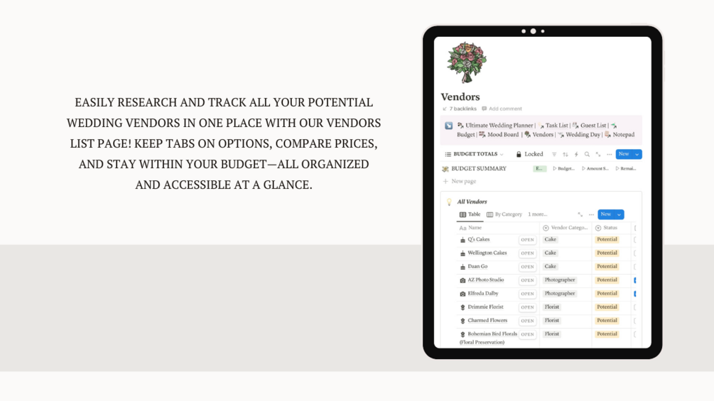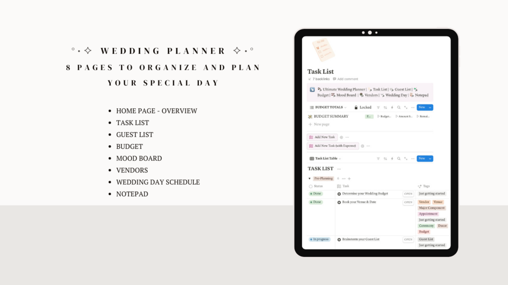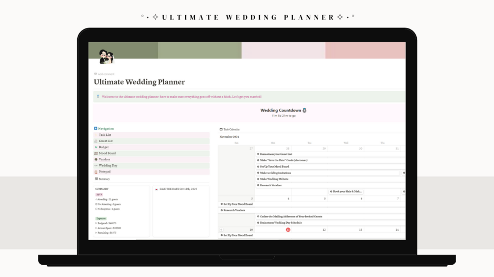 Plan your dream wedding effortlessly with this all-in-one Notion Wedding Planner Template!
